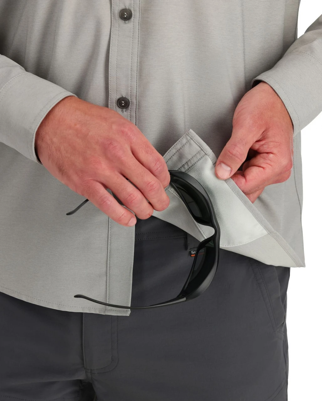 - Chest pockets constructed with drop-in button closure. Left chest pocket has bonus hidden zippered pocket and sunglass/pen slot with bartack reinforcements.